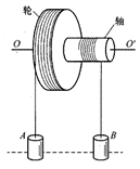 15.如图所示,一个轻质轮轴,轮的半径为R,轴的半径为r(R=3r)。在轮周绕有轻绳,绳端悬挂一质量为M的重物A。在轴上也绕有轻绳,绳端悬挂一质量为m的重物B(M=2m)。开始时AB在同一高度。自静止起放手后,A下降B上升。求A下降h高度时速度的大小。(摩擦及其他阻力不计)