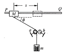 23.质量为M的滑块套在光滑的水平长杆PQ上,它的下面所系的细线跨过定滑轮以与质量为m的重物相连。M与滑轮间水平距离为s,开始时处于静止状态,绳与水平面夹角为θ,放手后在m的带动下M向右运动,当M运动至滑轮正上方时,m与M的速度各为多大?如果与滑轮a相对称还有滑轮b,这时你将看到什么现象?