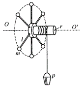27.如图所示,在半径为r的轴上悬挂一个质量为M的水桶p,轴上分布着6根手柄,柄端有6个质量为m的金属球。球离轴心的距离为l。轮轴、绳及手柄的质量以及摩擦均不计,放手后在桶的重力作用下整个装置发生转动,求转动n周后水桶的速度。