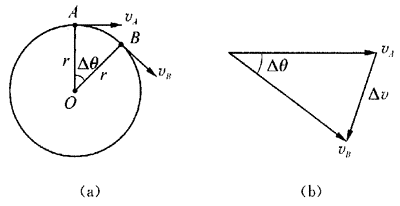 如图(a)所示,质点沿半径为r的圆周做匀速圆周运动,在某时刻处于A点,速度是vA,经过很短的时间Δt后,运动到B点,速度是vB。在图(b)中,按照矢量相加的运算法则,质点从A点运动到B点时速度的变化量为Δv,A、B两点的速度和速度的变化量构成一个矢量三角形,质点在Δt时间内的平均加速度a=\(\frac{{\Delta v}}{{\Delta t}}\),平均加速度的方向就是矢量Δv的方向。当Δt趋近于零时,B点无限靠近A点,平均加速度的极限就是质点在A点的瞬时加速度。在图(b)中,vA和vB的大小相等,当Δt趋近于零时,vA和vB的夹角也趋近于零,这时Δv的方向就垂直于vA,即沿着半径指向圆心,因此,质点做匀速圆周运动时,它在任一点的瞬时加速度都是沿着半径指向圆心的,我们就把匀速圆周运动的加速度叫做向心加速度,向心加速度反映了速度方向的变化快慢。那么向心加速度的大小是多少呢?推导过程如下,由加速度的定义可知,a=\(\frac{{\Delta v}}{{\Delta t}}\),当Δt趋近于零时,图(b)中的Δθ角也趋近于零,此时Δθ角所对的弧长和弦长Δv的差异可以忽略,即Δv=vΔθ。因此,a=\(\frac{{\Delta v}}{{\Delta t}}\)=\(\frac{{v\Delta \theta }}{{\Delta t}}\)=vω=\(\frac{{{v^2}}}{r}\)。运用线速度与角速度的关系,还可得出a=ω2r,这就是我们前面用实验和牛顿定律得出的向心加速度公式。