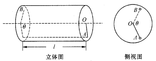 27.运用圆周运动的知识可以测定子弹的速度。图中纸质圆筒绕中心轴O以角速度ω顺时针旋转,子弹以一定速度沿与轴线平行的方向,从圆筒的一个底面的A点射入,从另一个底面的B点射出,射入点与射出点所在半径的夹角为θ,若圆筒的长度为l,求子弹的速度v。
