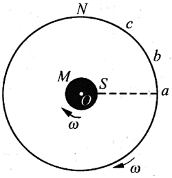当v1,v2、ω都不变时,粒子从M筒到达N筒和筒转一周所用的时间都是确定的,设它们分别用t1、t2和T表示,粒子落在什么地方取决于这三个时间的关系。如果T恰好是t1和t2的公约数,那么两种不同速度大小的粒子都落在同一点以处;如果和的余数相等且不为零,两种不同速度大小的粒子将落在a处之外的某一b处;如果和的余数不相等,则两种不同速度大小的粒子落在两处,由于落点离以处的弧长分别为Rωt1=和Rωt2=都有确定的值,因此在圆筒内壁上不可能到处是粒子。