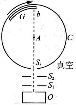 33.如图为蔡特曼(Zartman)用了测定分子速度大小的装置。O是一个小炉,金属银在其中熔化并蒸发,银原子由小孔逸出,穿过狭缝S1、S2成分子射线进入抽空区域,圆筒C可绕水平轴A以角速度ω=100 rad/s转动。若C不转,分子束穿狭缝S2进入圆筒,投射到弧形玻璃板G上的b1点,并粘附在该处。当C以角速度ω转动时,将发现有分子粘附在G板上的b2处,量得b1和b2间的弧长s=1 cm,已知圆筒半径为R=10 cm,且Ab1=Ab2=r=9 cm。试求这些分子的速度大小。
