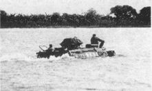 靠履带划水,行驶的速度是很慢的,一般一小时走7km左右。为了提高速度,研制人员除在不超重的前提下增大发动机马力之外,还想了许多辅助的办法,比如,在车体尾部加装喷水推进器或螺旋桨推进器,在甲板上安装防浪板。特别是改进车体的形状,由挡水型改为滑水型(流线型),在流体动力的作用下,随着速度的增加,车体的入水部分将逐渐被托出水面,以减少水的阻力。现在世界上先进的两栖装甲突击车,其航速已达每小时30 km以上。