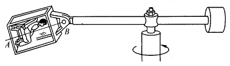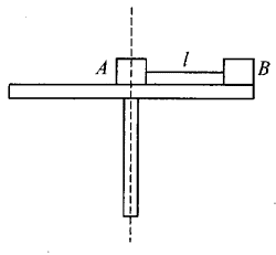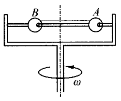 44.如图所示是用来研究圆周运动的仪器,球A、B可以在光滑杆上无摩擦地滑动,两球之间用一细轻线连接,若mA=2mB,当仪器以角速度ω匀速转动,并达到稳定时,则( )
