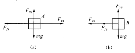 首先确定B物体为研究对象,当转台转动时,B物体随转台做匀速圆周运动,开始仅靠指向圆心的静摩擦力即可维持圆周运动,当角速度增大时,还需要绳的拉力,在竖直方向上,B物体受到的重力mg和转台对B物体的支持力FNB相平衡,其受力示意图如图(b)所示,而A物体受力示意图如图(a)所示,A作为位于轴心的质点,不做圆周运动,沿半径方向的静摩擦力和绳的拉力平衡,说明绳的拉力也有最大值,就是A物体受到的最大静摩擦力。于是,使B物体做匀速圆周运动的向心力由B物体受到的静摩擦力和绳对B物体的拉力提供,如果转速越大,所需静摩擦力也越大,直至达到最大静摩擦力。也就是说转台的角速度有最大值,超过最大值,两物体都要被甩出平台。