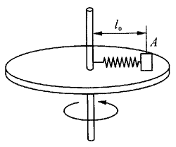 48.在水平放置的可旋转的圆台上面放一根劲度系数为k,原长为l0,质量可忽略不计的轻弹簧。弹簧的一端固定在轴上,另一端连接一个质量为m的物体A,如图所示。如果物体能够随圆盘一起以角速度ω转动,并且可以沿径向自由滑动,求弹簧的伸长。