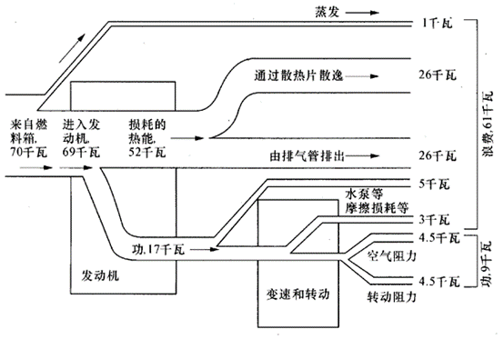 汽车发动机将汽油或柴油中的部分内能(化学能)转化为机械能是一种“热变功的过程”,其效率受到热力学第二定律的制约,发动机可能达到的理论效率大约是40%。然而,由于不完全燃烧、产生NO2、发动机中的摩擦力,以及通过发动机外壳的热损耗,实际效率往往不到25%。下图为一辆在高速公路上匀速行驶的小汽车内典型的能量流动图[摘自(美)霍布森著,秦克诚等译:物理学:基本概念及其与方方面面的联系,上海科技出版社(2001)]