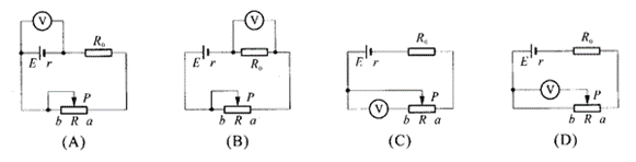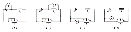 69.如图所示的(A)、(B)、(C)、(D)四个电路中,电源电动势为E,内阻为r,R0为定值电阻。当滑动变阻器R的滑片P从a向b滑动时,电压表的示数将变大的电路是( )
