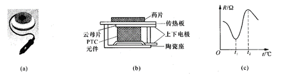 70.图(a)是家用电热驱蚊器的外观照片,图(b)是它的结构示意图,其电热部分的主要元件是PTC(由钛酸钡等半导体材料制成的电阻器),其电阻与温度的关系如图(c)所示,由于这种特性,PTC元件具有发热、控温双重功能。因此,下列判断中正确的是( )