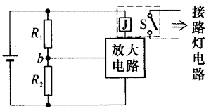 72.光敏电阻是由半导体材料制成的,受到光照射耐,其导电性能显著增强;它的灵敏度高,制造工艺简单,广泛应用于自动控制电路中。将其与电磁继电器结合,就可用来自动控制街道路灯的开与关。图中所示是自动控制路灯的工作原理图,我们希望环境光照暗到一定程度时,路灯能点亮。电阻R1、R2之一是光敏电阻,另一只是定值电阻。当放大电路的输入端电压升高到某一值,使经过继电器J的电流增大到受继电器控制的电键S闭合,路灯就被点亮,请你分析判断电阻R1、R2中哪个是光敏电阻?