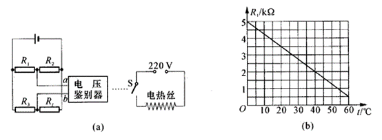 74.图(a)为在温度10℃左右的环境中工作的某自动恒温箱原理示意图。箱内的电阻R1=20 kΩ,R2=10 kΩ,R3=4 kΩ,Rt为热敏电阻,它的电阻随温度变化情况如图(b)所示。当a、b两端电压Uab<0时,电压鉴别器会令电键S接通,恒温箱内的电热丝发热,使箱内温度提高;当Uab>0时,电压鉴别器使S断开,停止加热,恒温箱内的温度恒定在______℃。