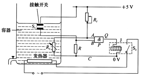 筒中水位达到S1时,B点与电源正极接通,当然是高电势。如果水温低,则RX电阻很大,与变阻器RY串联后分到的电压也很高,与门P输出端Q为高电势,使电磁铁工作,开关S2导通,发热器对水加热。如果水温高了,热敏电阻呈现低电阻,A端电势低;或者水位很低,接触开关S1不通,B端电势也低。这两种情况“与”门P都输出低电势,继电器和电热丝都不工作,停止加热。