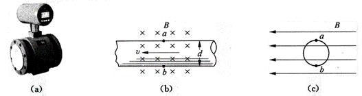 从图(b)、(c)可以看出,由于流体是导电的,可以把ab看作是正在“切割”磁感线的直导线l,而且B、l、v三者之间是互相垂直的,管壁上a、b两点间的电势差为E=Blv(不计导电液体的电阻,a、b两点间的电势差即为感应电动势的大小;从图中还可以看出管子的直径d即为导线长l)。