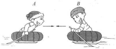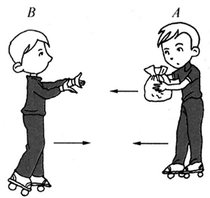 4.如图所示,两个质量均为 50 kg 的溜冰人 A 和 B,在冰面上相向运动,速度均为 3 m/s,A 的手中有一个质量为 10 kg 的沙袋。为了避免相撞,A 将沙袋丢给 B,B 接到沙袋后又丢还给 A,就这样不断地相互丢抛沙袋,最终可以避免相撞,甚至分离。