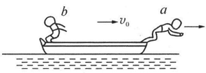 6.质量为 M 的小船以速度 v0 行驶,船上有两个质量皆为 m 的小孩 a 和 b,分别静止站在船头和船尾。现小孩 a 沿水平方向以速率 v(相对于静止的水面)向前跃入水中,然后小孩 b 沿水平方向以同一速率 v(相对于静止水面)向后跃入水中,求小孩 b 跃出后小船获得的速度。(水的阻力不计)