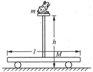18.如图所示,一质量为 m 的青蛙,蹲在质量为 M 的小车的细杆顶上,小车放在光滑的水平面上,若车长为 l,细杆高为 h 且位于小车的中点,试求:青蛙至少要以多大的水平速度 v 跳出才能落到水平面上。