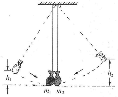 20.【小实验】有一包质量未知(设为 m1)颗粒状物品,悬挂在天花板下,可以自由摆动,某同学想用另一包已知质量为 m2 的物品与 m1 相碰来估测它的质量。于是用同样长的绳子将 m2 紧挨着 m1 悬挂在天花板下,将 m1 向左拉起一定的高度 h1,将 m2 向右拉起一定的高度 h2,同时放手让它们在低处相碰(在偏角不太大时,碰击点可看作在最低点)。观察碰撞后是一起摆动(在两包物品外表面均贴有粘纸,碰后粘合在一起运动)。调节高度 h2,使它们相碰后恰好静止不动,就能估算出 m1 的质量。写出用 m2 表示的计算表达式。有条件的情况下,建议你做一做这个实验。