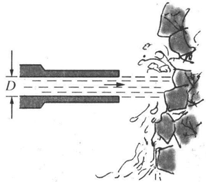 35.水力采煤中(如图),水枪在高压下喷射出强烈的水柱,冲击煤层,设水柱直径 D 为 30 mm,水速口为 56 m/s,假设水柱垂直射在煤层表面,冲击后速度变为零,求水柱对煤的平均冲击力。