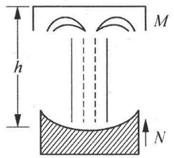 37.由高压水枪中竖直向上喷出的水柱,将一个质量为 M 开口向下的小铁盒倒顶在空中,如图所示,已知水以恒定速率 v0 从横截面积为 S 的水枪中持续不停地喷出,向上运动并冲击铁盒后,以不变的速率竖直返回,求稳定状态下铁盒距水枪口的高度 h。