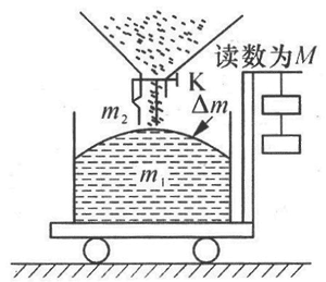 38.许多粮店使用的自动称米机,其原理如图所示,开关 K 能控制存放在粮店顶部米的流出和切断,由于自动装置在切断米流同时,就能显示称米机的读数 M,故部分买者认为:因为米流落到容器中时有向下的冲力,读数偏大;而部分卖者则认为:当预定米的质量数满足,自动装置切断米流时,此刻尚有一些米仍在空中,这些米是多给买者的。试分析自动称米机的读数正确与否?