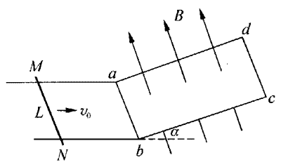 如图所示,两根光滑水平导轨与一个倾角为α的金属框架abcd连接(连接处呈圆弧形)。磁感应强度B跟框架面垂直,框架边ab、cd长均为L,电阻均为2R,框架其余部分电阻不计。有一根质量为m、电阻为R的金属棒MN平行于ab放置,让它以初速v0冲上框架,在到达最高点的过程中,框架边ab发出的热量为Q。试求 :