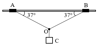 27.如图所示,三根轻线结于O点,并分别与套环A、B和重物C连接,A、B环重均为50 N,套在水平横杆上,C重为120 N,AO与BO两线等长并与横杆的夹角均为37°,整个系统处于静止状态,(sin37°=0.6,cos37°=0.8)求: