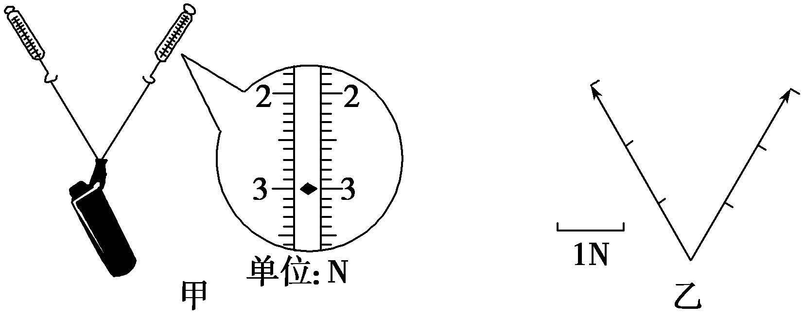 (C)将一根大约30 cm长的细线从杯带中穿过,再将细线两端分别拴在两个弹簧测力计的挂钩上.在靠近白纸处用手对称地拉开细线,使两个弹簧测力计的示数相等,在白纸上记下细线的方向,弹簧测力计的示数如图甲所示