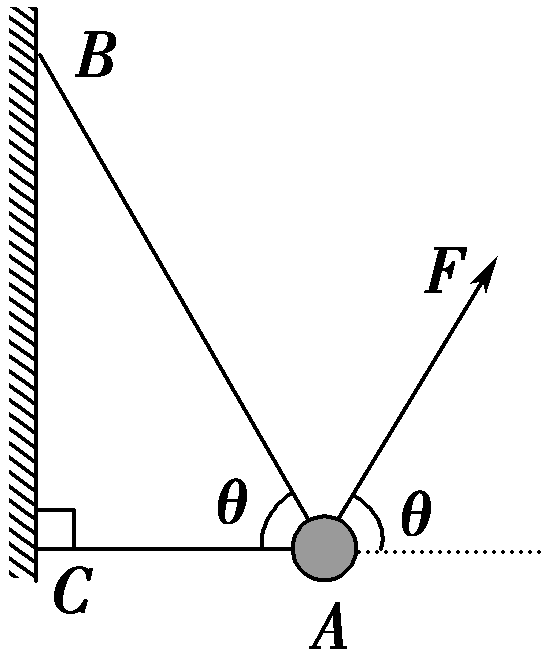 (2)假设AB绳刚好伸直且FAB=0,则Fsinθ=mg⇒F=\(\frac{{mg}}{{\sin \theta }}\)=\(\frac{{2\sqrt 3 }}{3}\)mg=\(\frac{{20\sqrt 3 }}{3}\) N