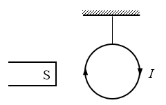 16.在条形磁铁S极附近悬挂一个线圈,线圈与水平磁铁位于同一竖直平面内。当线圈中通以顺时针方向电流时,如图所示,将会出现( )