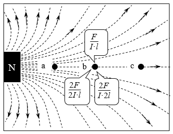 5.用精确的实验可以得到如下结果:如图所示,垂直于磁场方向的很短的一小段通电导线在磁场b处,导线中电流是I,导线长为l,受到磁场力为F;如果长度不变而电流变为2I。则磁场力变为2F;如果电流不变,长度变为2l,则磁场力也变为2F。即在b处,\(\frac{F}{{Il}}\)的值是一定的。如果将这小段通电导线放在磁场中不同位置(如a、c),那么这个比值是_____(选填“相同”或“不同”)的。于是我们可以用某处的比值\(\frac{F}{{Il}}\)来描述磁场在该处的强弱,这个比值叫做磁感应强度。这种定义物理量的方法叫做_____法。