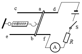 20.如图所示,金属棒ab中点连着一弹簧测力计,水平地放置在两根互相平行的光滑金属导轨cd、ef上,cd与ef间有一匀强磁场垂直导轨平面,导轨宽0.1 m,闭合电键S后,弹簧测力计的示数为0.4 N,电流表的示数为10 A。求: