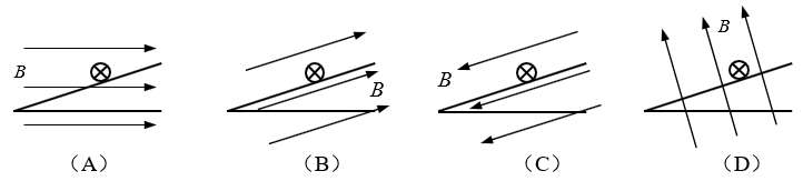 27.匀强磁场中有一倾斜的光滑导轨,如图所示的4个图中,标出了4种匀强磁场的方向。将一金属导体棒置于导轨上,当通以垂直纸面向里的电流时,导体棒可能在导轨上保持静止的是图中的( )