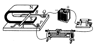 29.如图所示,蹄形磁铁水平放置,在磁场中有一水平光滑导轨,通过接线柱P、Q与导线相连,导轨上面搁有一导体细棒AB。导线将AB棒、电源、变阻器、电键等构成电路。闭合电键,可观察到导体棒AB向______(选填“左”或”右”)运动,此现象表明通电导线在磁场中_________。