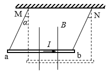 21.如图所示,质量为m、长为l的水平金属棒ab通过两根轻细金属丝悬挂在绝缘架MN的下面,整个装置处于竖直方向的匀强磁场中,当棒中通有由a到b的电流I后,棒ab将离开原来的位置偏离α角而平衡。则磁场的磁感应强度B=________,方向________。