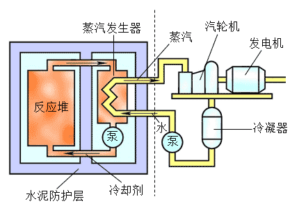 这一题考查的知识点是核电站,要求知道在核电站的发电过程中能量的转化情况。在核电站系统中有两个循环系统,虚线左侧为第一循环系统,右侧为第二循环系统。核能来源于图中左侧的反应堆,核反应产生的大量的热通过第一循环系统带至蒸汽发生器,这一过程核能转化为内能。蒸汽发生器产生大量的高温蒸汽,蒸汽进入汽轮机做功,使汽轮机转动,从而带动发电机发电,内能先转化为机械能最后转化为电能。第二循环中的蒸汽从汽轮机中排出后进入冷凝器充分冷却变成水,再一次进入蒸汽发生器吸收热量,如此循环往复,完成发电过程。