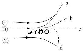 卢瑟福通过α粒子散射实验,判断出原子的中心有一个很小的核,并由此提出了原子的核式结构。如图所示的示意图中,①、②两条线表示实验中α粒子运动的轨迹,则沿③所示方向射向原子核的α粒子可能的运动轨迹为( )