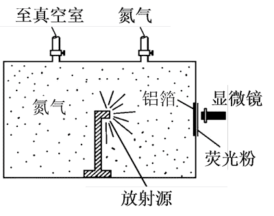 这是卢瑟福发现质子的实验装置,也是世界上第一次完成的人工转变。当装置未通氮气时,通过显微镜可以观察到荧光粉发光,这是因为放射源衰变放出的α射线造成的。调节铝箔的厚度,使其恰好能挡住α射线,不再能观察到荧光粉发光。通入氮气,又能观察到荧光粉发光,卢瑟福由此断定α射线轰击氮原子核产生了其他粒子,就是质子。