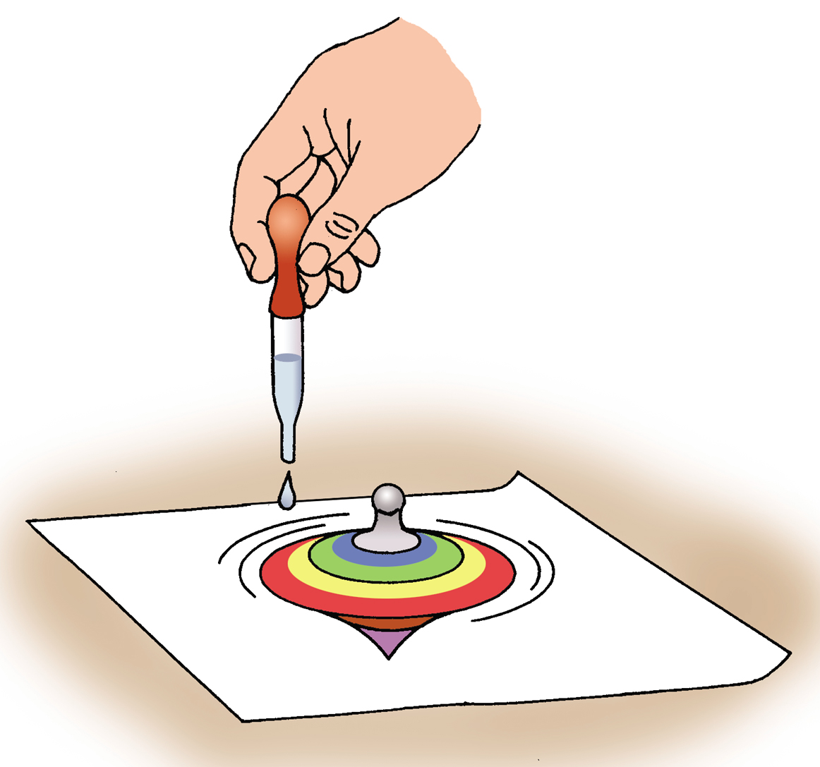 根据线速度方向的特点,墨水会沿陀螺边缘的切线方向飞出。