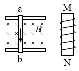 棒 ab 在做切割磁感线运动,由右手定则可以判断运动方向向左;由右手螺旋定则可以判断此电流在螺线管内部产生的磁场方向向上,即 N 指向 M。
