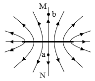12.均匀带电细棒周围电场的电场线分布如图所示,MN 为细棒中垂线。a、b 为 MN 上的两点,它们的电场强度大小分别为 Ea 和 Eb。这两点的电场强度( )