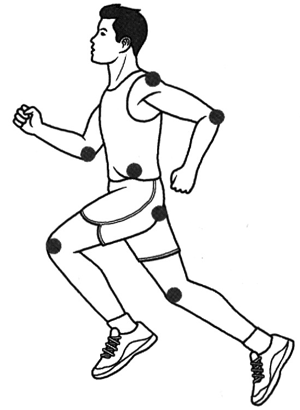 7.为研究运动员沿着平直跑道跑动的快慢,某同学猜想身体某一部位的运动可以近似视为直线运动,用这个部位的运动来代表运动员整体的运动。为了验证这种猜想,他设计了一个方案:在操场直跑道上每隔1 m做一个明显的记号,在一位同学的肩、腰、臀、肘、膝贴上不同颜色的圆形标记,拍摄一段同学沿直跑道跑动10 m的视频。你能根据视频绘制各个标记点的轨迹,由轨迹解释哪个标记点最能代表运动员整体的运动吗?