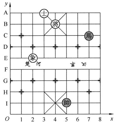 14.中国象棋棋盘上有10条横线,9条竖线。我们用如图1-4所示的平面直角坐标来描述棋子的位置,横轴上标数字,纵轴上标字母,棋子的位置可用“字母+数字”的形式来描述。甲、乙双方对弈的过程中,甲方的“将”和乙方的“马”处于如图所示位置,乙方先走“马”,只需一步从C7到A6,即可形成对甲方的“将军”’之势。如果棋盘上的每一小格为边长3 cm的正方形,则这一步中,“马”的位移是多少?在图中画出其位移矢量。