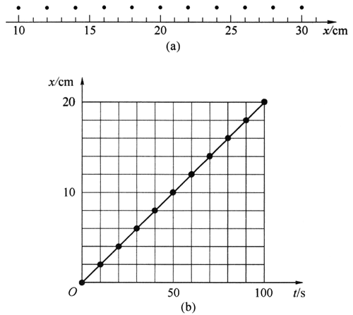 16.一只蚂蚁在地面上沿直线爬行,每隔10 s记录蚂蚁头部的位置,如图(a)所示。某同学认为蚂蚁的运动可以用图(b)中的位移-时间图像来描述。你是否认同该同学的观点?说明理由。