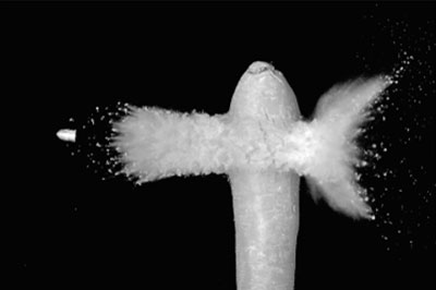 根据照片中胡萝卜直径和子弹长度10∶3的关系,先估算胡萝卜的直径d。把子弹看作质点:设子弹的速度在这么短的时间内不变,根据t = \(\frac{d}{v}\)就可估算出子弹穿过胡萝卜的时间为7×10−5 s。这样的估算比较粗糙,更接近实际情况的估算应考虑子弹的长度x,设子弹的速度在这么短时间内不变,根据t = \(\frac{{x + d}}{v}\)就可估算出子弹穿过胡萝卜的时间约为9×10−5 s。