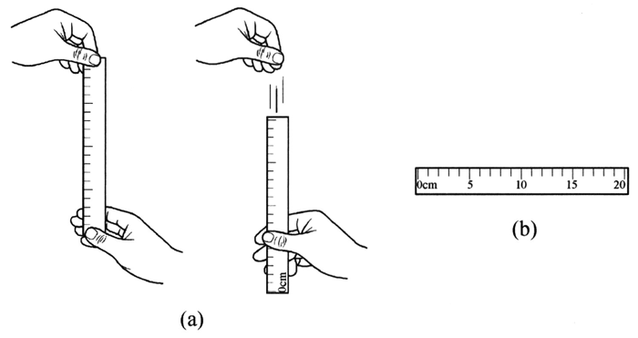12.可用如图所示的方法来测量人的反应时间。测量员将刻度尺最下端置于被测人员的拇指和食指之间(未接触)。被测人员看到刻度尺被释放后尽快用拇指和食指抓住刻度尺。根据被测人员抓住刻度尺的位置可推得此人的反应时间。简述该方法的测量原理。测量时选用测量长度为20 cm的刻度尺[图(b)]是否合适?如果在刻度尺的1 cm、2 cm、3 cm…处标记相应的反应时间t1、t2、t3…,则t2 – t1、t3 – t2、t4 – t3、…的大小如何变化?说明理由。