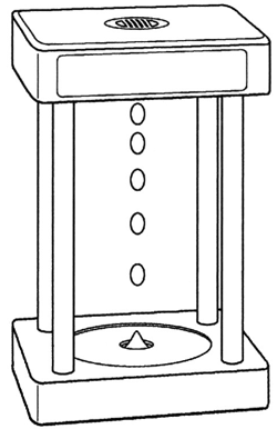 每经过相等时间间隔落下一个水滴,空中的水滴分布在一条直线上,光源闪烁的频率与水滴滴落的频率相同,每次灯亮起,均可在相同位置看到水滴,产生水滴静止的错觉。