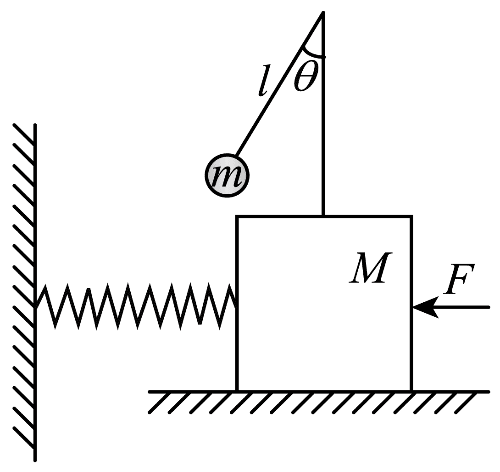 (1)为了减小晃动幅度,通常会在高层建筑上加装阻尼器,例如悬点固定在大楼上、摆锤质量为 m、摆臂长度为 l 的摆,摆臂是刚性的,质量可以忽略;大楼在风作用下的运动可简化为谐振子的强迫振动,谐振子的质量为 M,恢复力等效为劲度系数为 k 的弹簧,大楼在运动过程中可视为刚体。整个摆和谐振子系统如图所示,系统的总质量为 m 与 M 之和。风可视为水平方向上的强迫力 F(向左为正),它随时间 t 的变化为