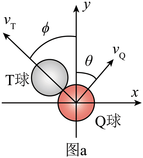(1)在发生碰撞后的瞬间,T 球和 Q 球的飞行方向与 y 轴之间的夹角分别为 ϕ 和 θ(见图 a)。求碰撞后的瞬间,两球飞行方向之间的夹角的值以及 Q 球的质心速度 vQ 和转动角速度 ω(用 ϕ,v0,ω0 等表示)。