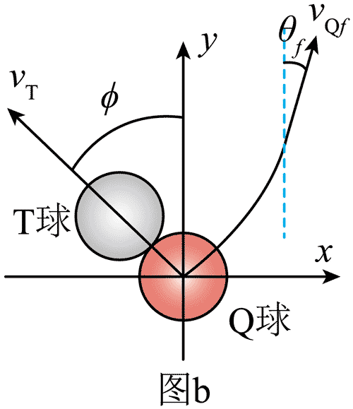 (4)现探讨台球手熟悉的 30° 角经验规则:自然伸开食指和中指(两指间角度大致为 30°);食指指向 Q 球初始飞行方向,在某些碰撞条件下,中指将大致告知球手 Q 球最终的飞行方向。在第(3)问中的条件下,Q 球与 T 球发生弹性碰撞后,已知 T 球沿角度 ϕ 飞出(见图 a),求